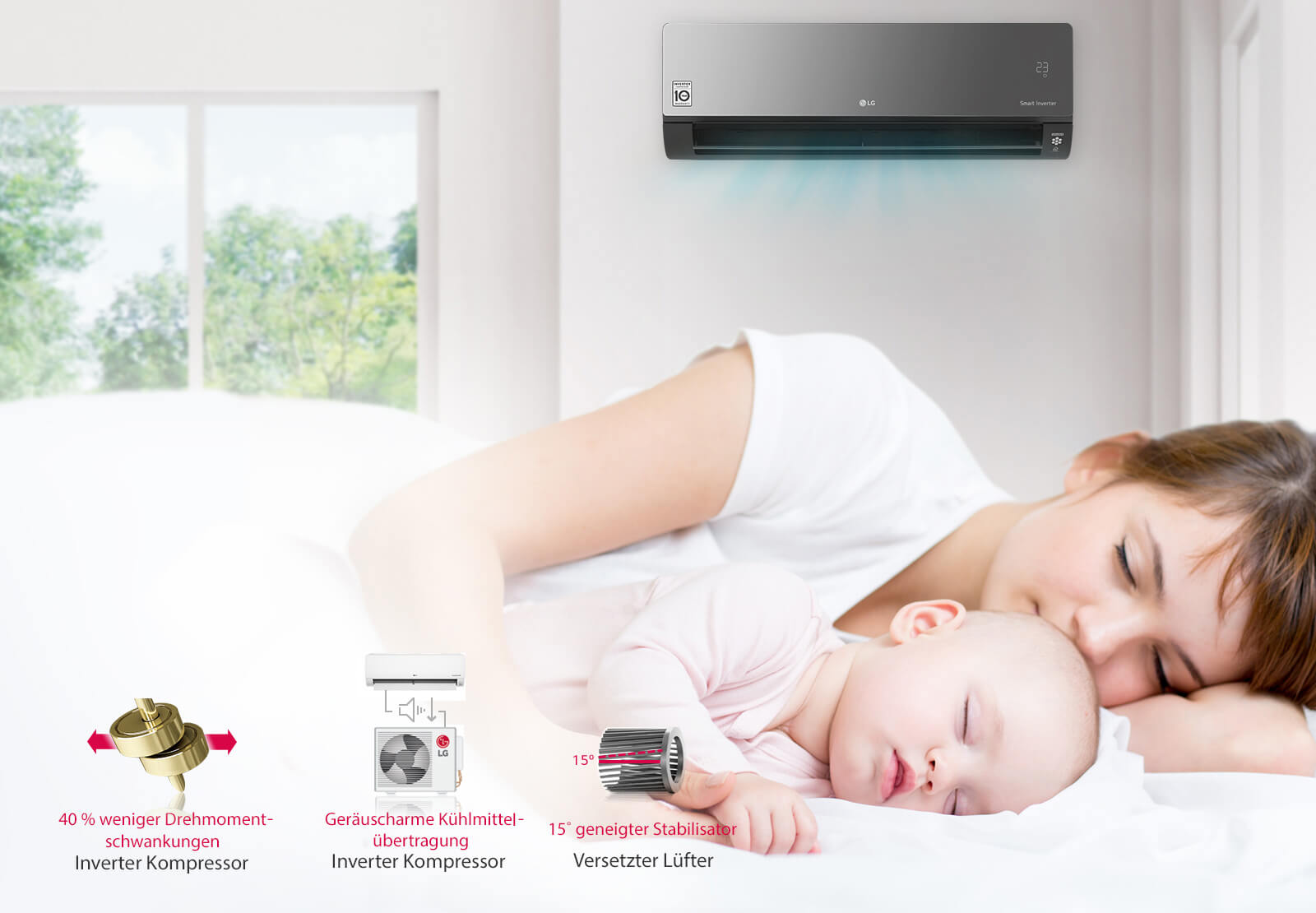 Due to the unique staggered fan and inverter compressor that eliminates unnecessary noise and offers smooth operation. LG air conditioners feature quiet operation.