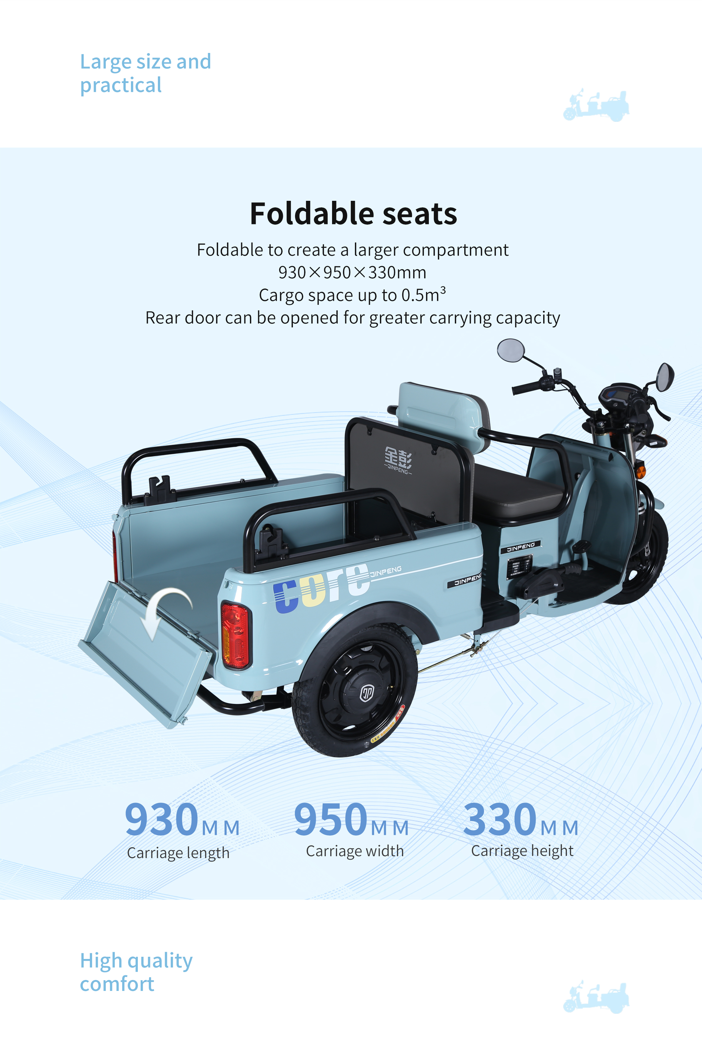 • Cargo Box Size : The cargo box measures 930×950×330 mm and features a folding design. When folded. it serves as a cargo box suitable for carrying goods; when unfolded. it becomes a rear seat that can accommodate two passengers. offering flexibility for various needs.