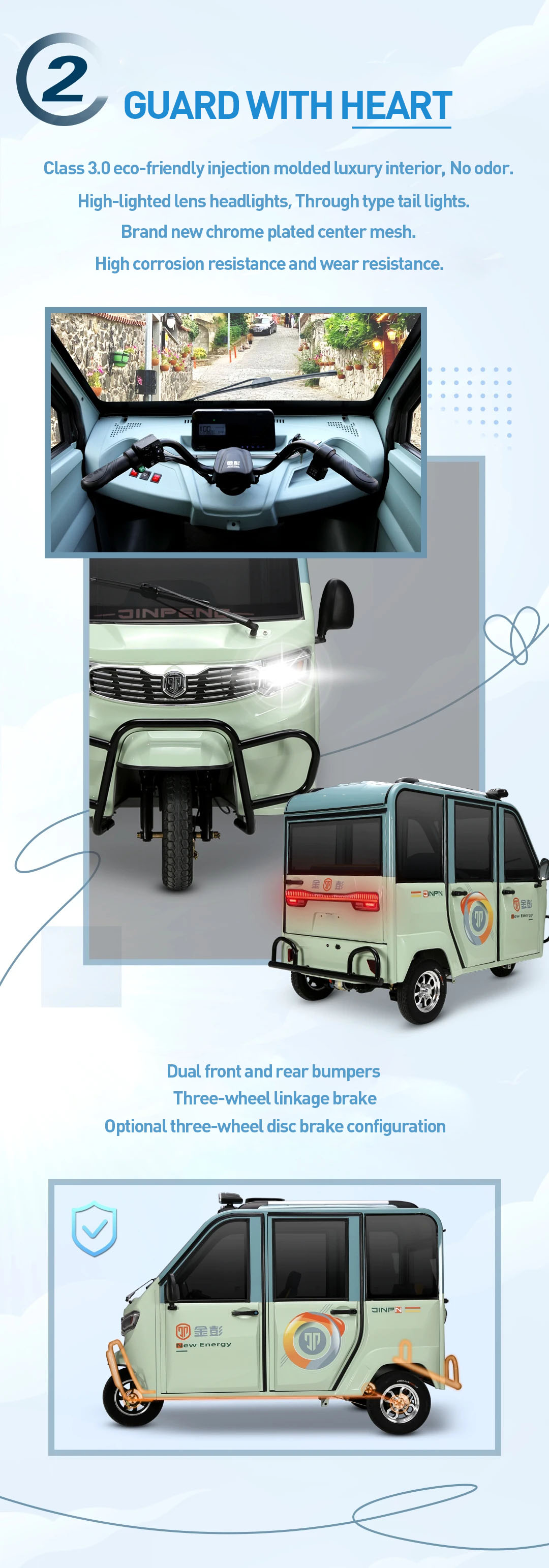 Safety design: double bumpers are set at the front and rear. The front of the car is equipped with highly translucent headlights and the rear is equipped with through-type taillights. Three-wheel linkage braking. short braking distance. safe and guaranteed