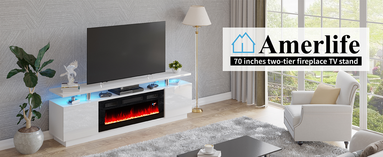 DetailBrand:AMERLIFEPower Source:Corded ElectricProduct Dimensions:14.4"D x 70.2"W x 22.6"HMaterial:Engineered WoodFinish Type:High Gloss & Matte whiteInstallation Type:FreestandingHeat Output:5100 British Thermal UnitsSpecial Feature:70" Modern High Gloss, Adjustable Flame&LED, Temperature Control & Time Setting, 36" Electric Fireplace, 2 Tier DesignStyle:ModernColor:White & Black