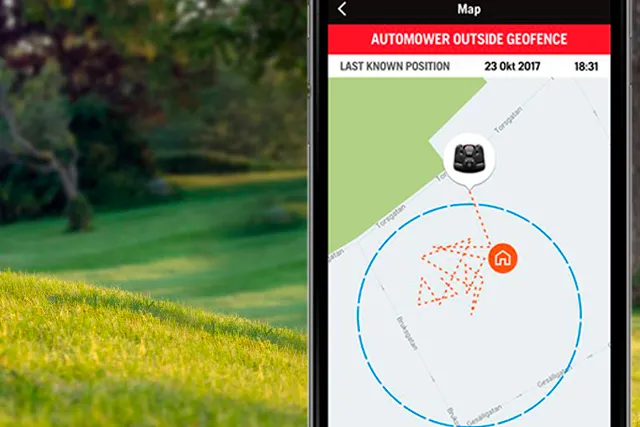 GeoFenceIf the mower is moved outside the predefined area, you will be notified in the app, minimising the theft risk. Simply use the Automower® Connect app to define your mower's GeoFence area, and you will always know where it is.