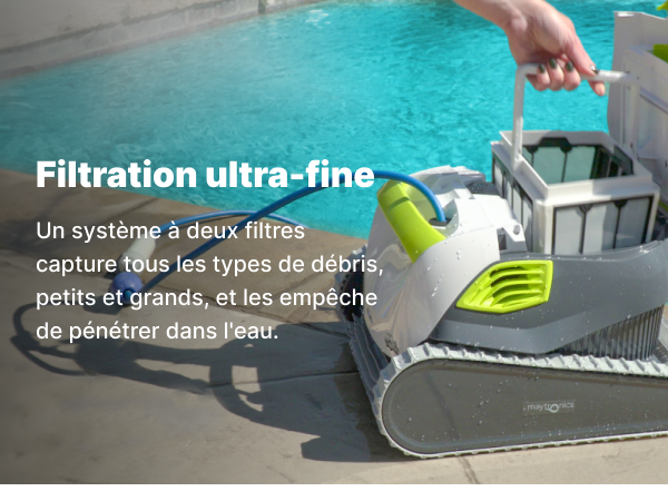 - Ultra-Fine Filtration: A dual-filter system captures all types of debris. large and small. and prevents it from entering the water.