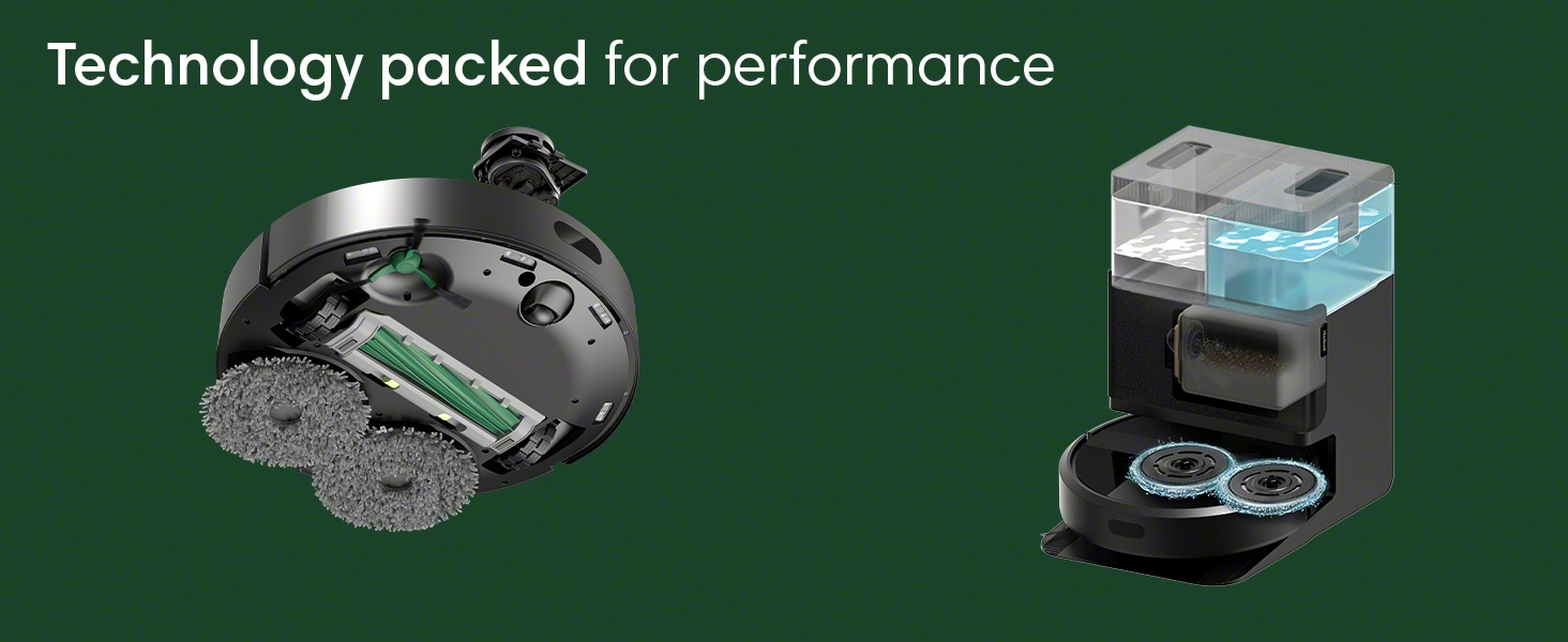 - STRONG SUCTION SERIOUS MOPPING. Devours messes from crumbs to pawprints with 70x more suction*, DualClean Mop Pads, SmartScrub, a multi-surface rubber brush, and edge-sweeping brush *As compared to Roomba 600 series robots