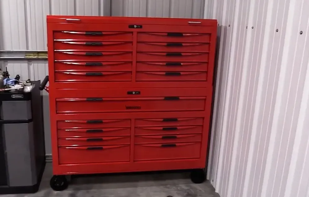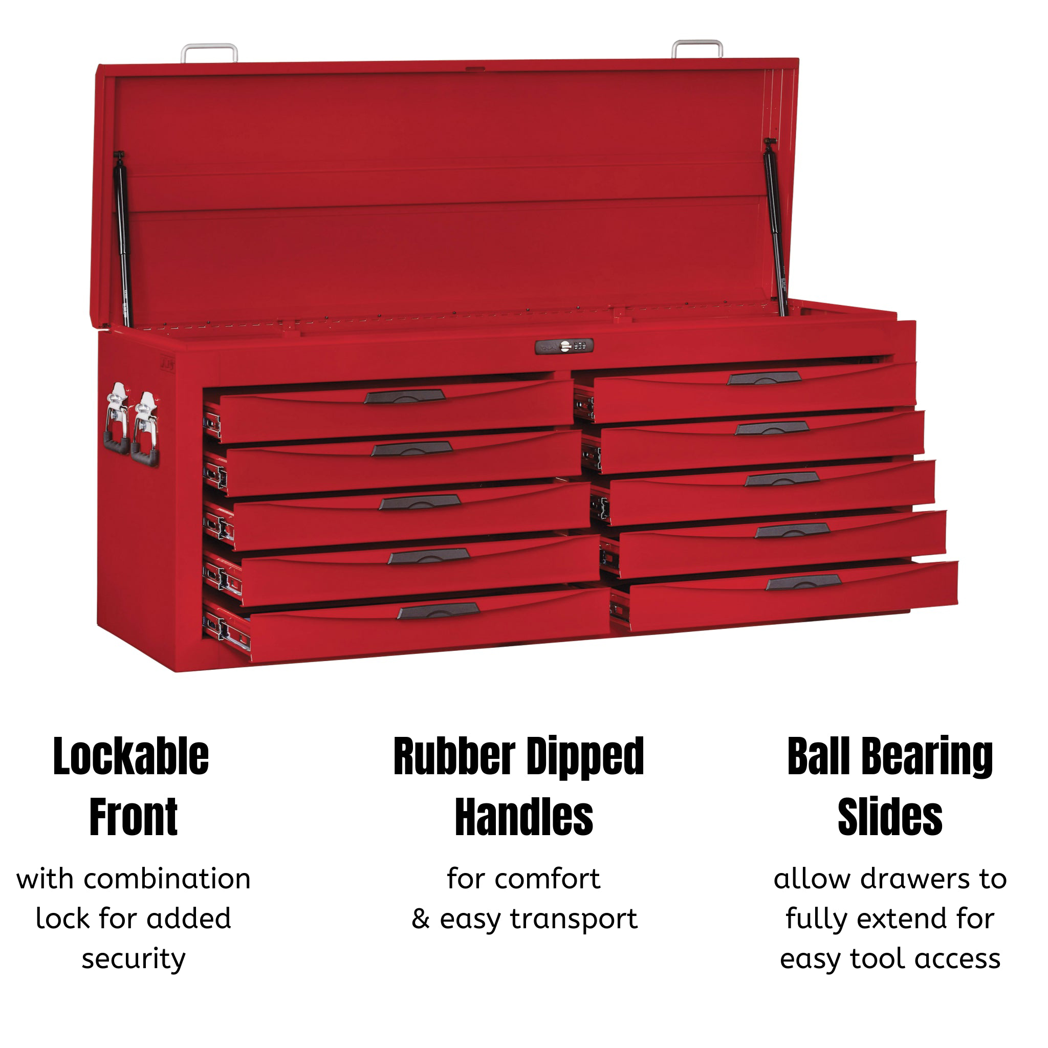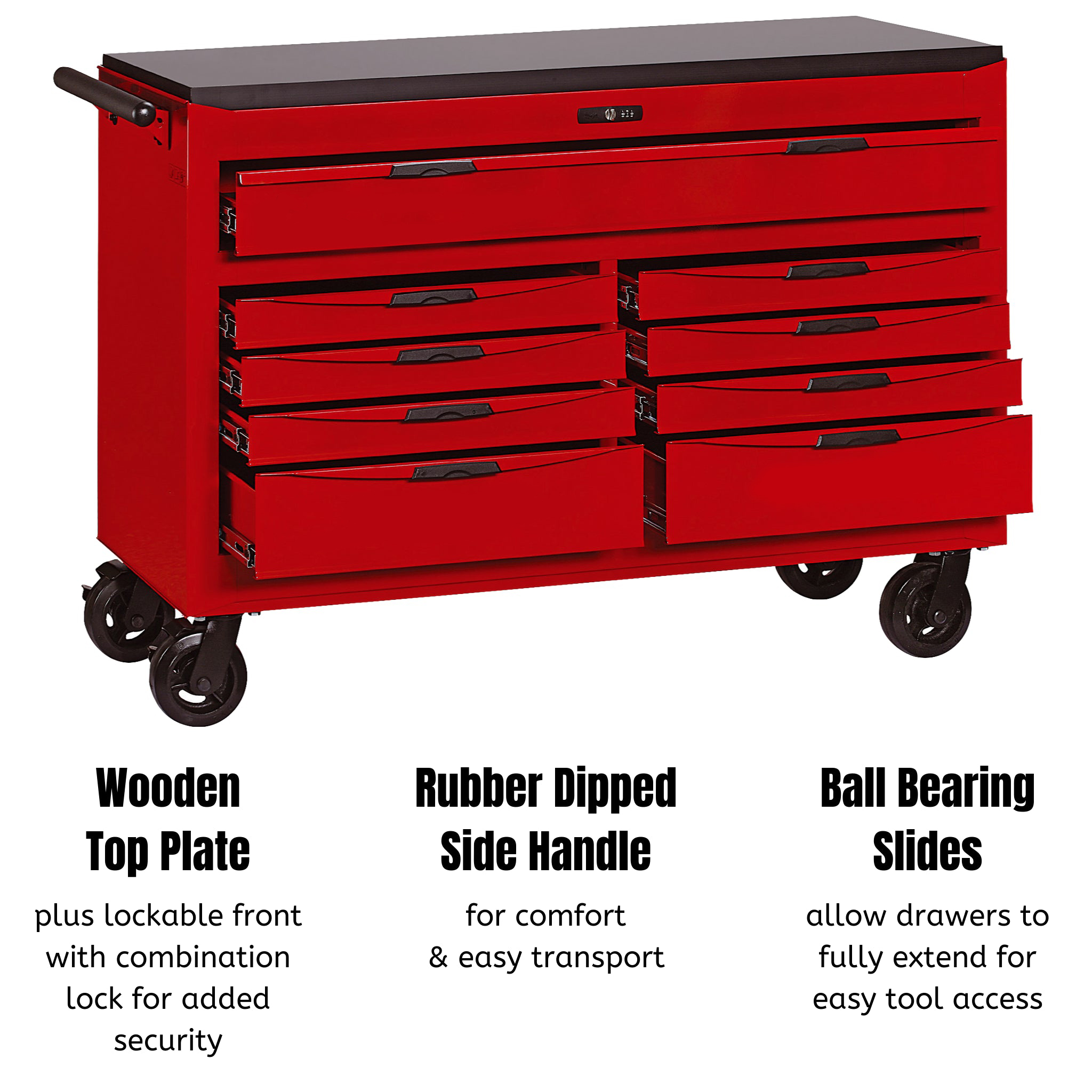 Tool box constructed from heavy gauge, high quality steel features 5-step rust prevention and underlay rubber-coated comfortable carrying handle, 5-inch caster wheels (two swivel and two with brake) for strength and stability, drawer is equipped with a 3-inch robustness Ball earing slide step allows it to be fully extended for greater access to tools and a combination locking system for increased safety.