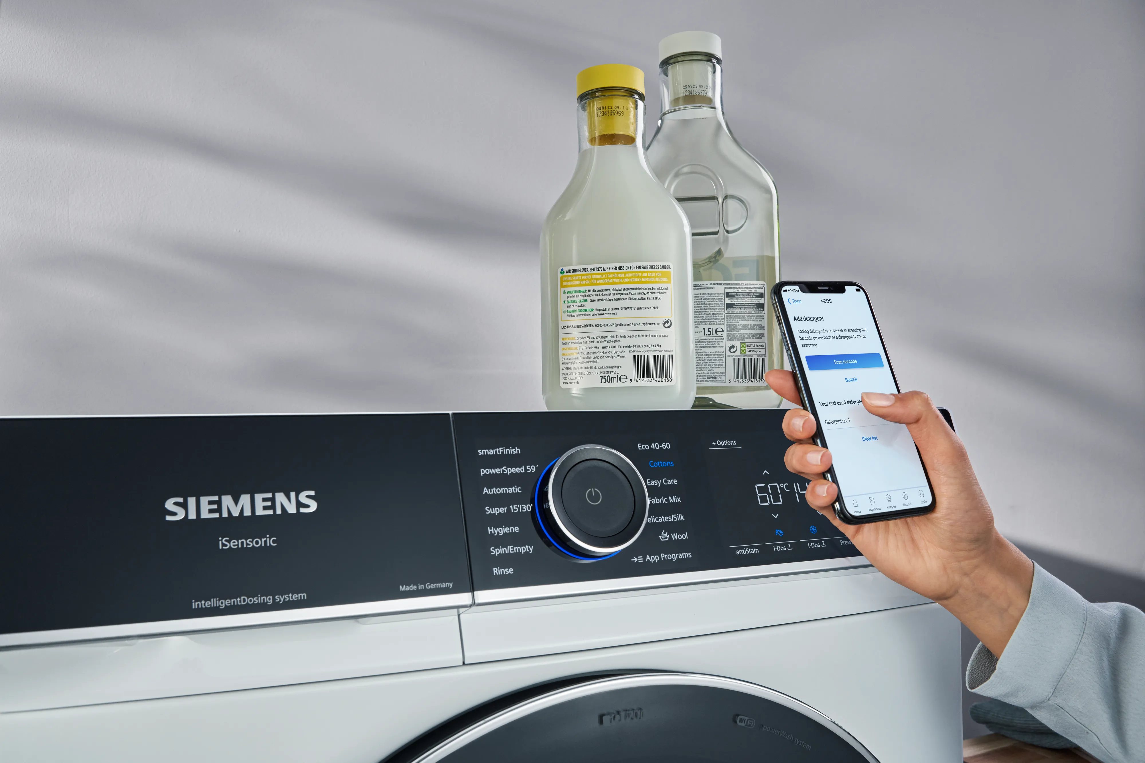 Whichever detergent and softener you use, the intelligent i-Dos Detergent scan function helps you set the dosage with maximum precision. Simply fill the containers and scan the barcodes on the bottles via the Home Connect app to send settings for water hardness and detergent consistency directly to your washing machine. The i-Dos system then dispenses the optimal amount of detergent, wash after wash. The Home Connect app also monitors detergent levels and sends you a notification before it runs out. *The Detergent scan function requires having a Home Connect account, for which separate terms of use apply. To use this feature you must install the Home Connect app on your smart device and link your washing machine to your Home Connect account.